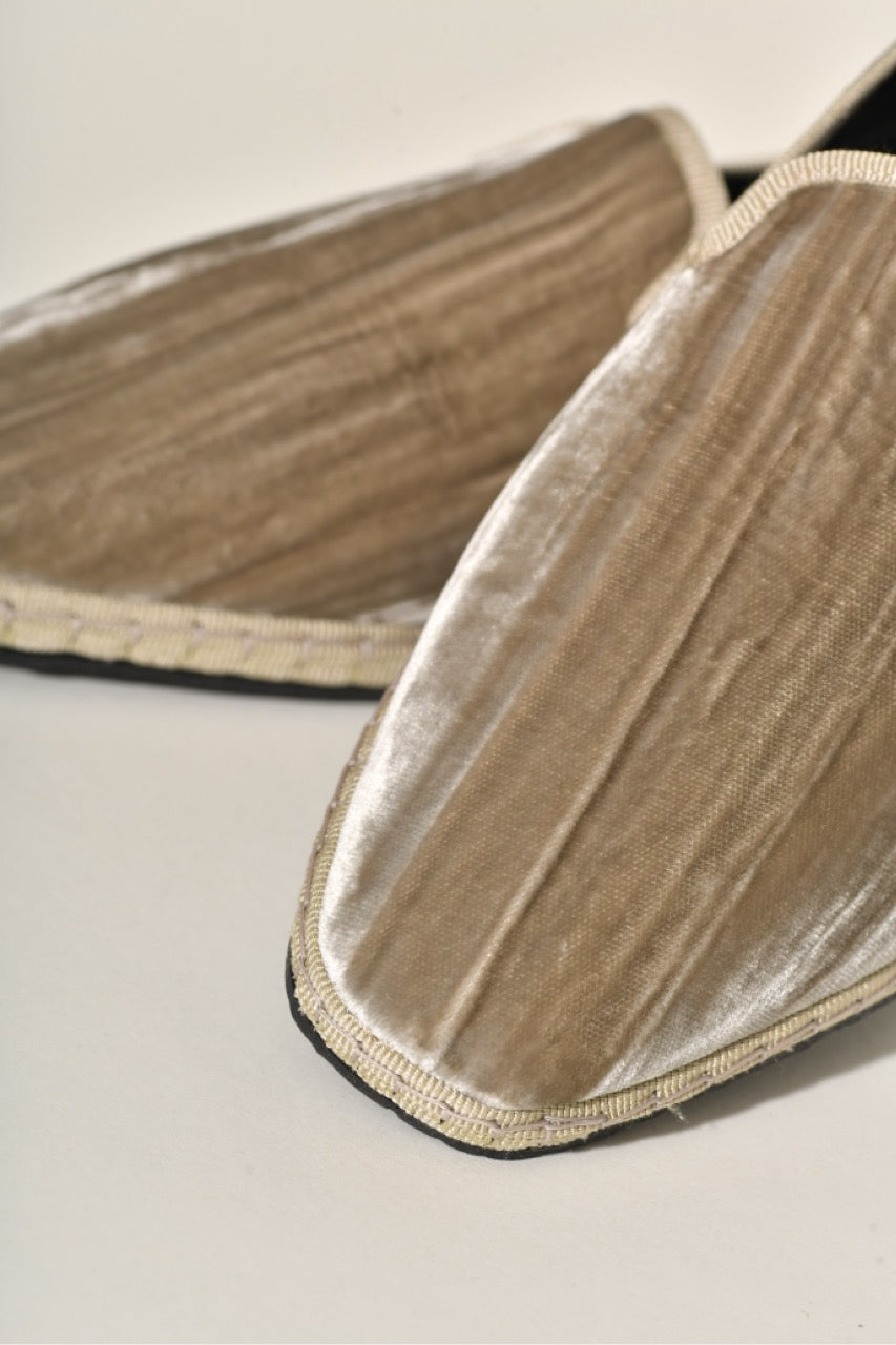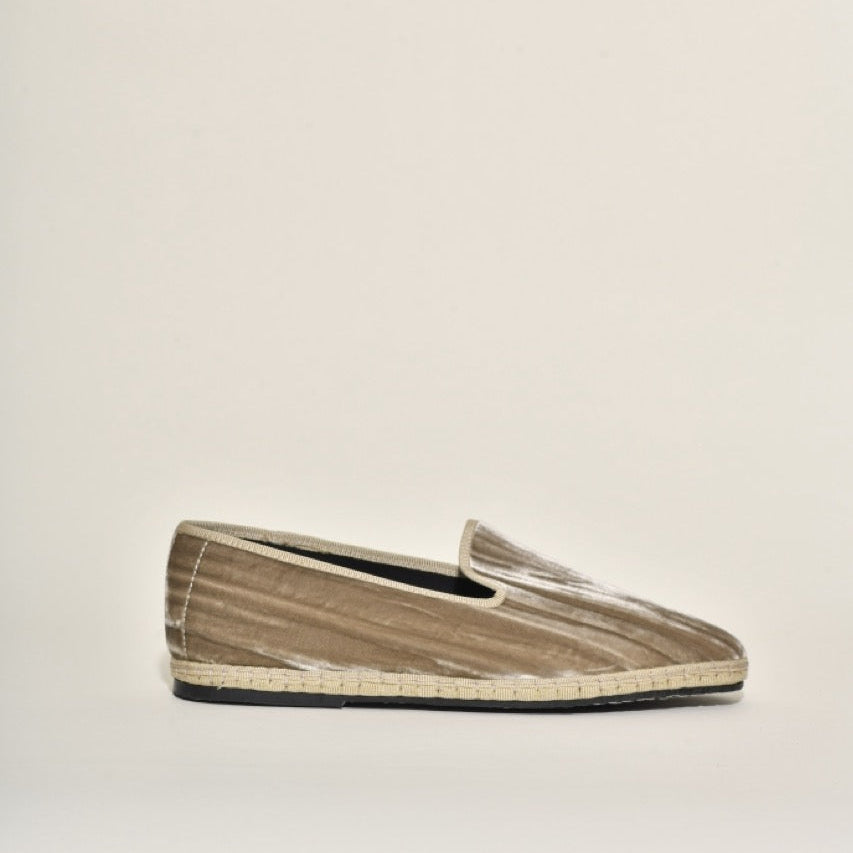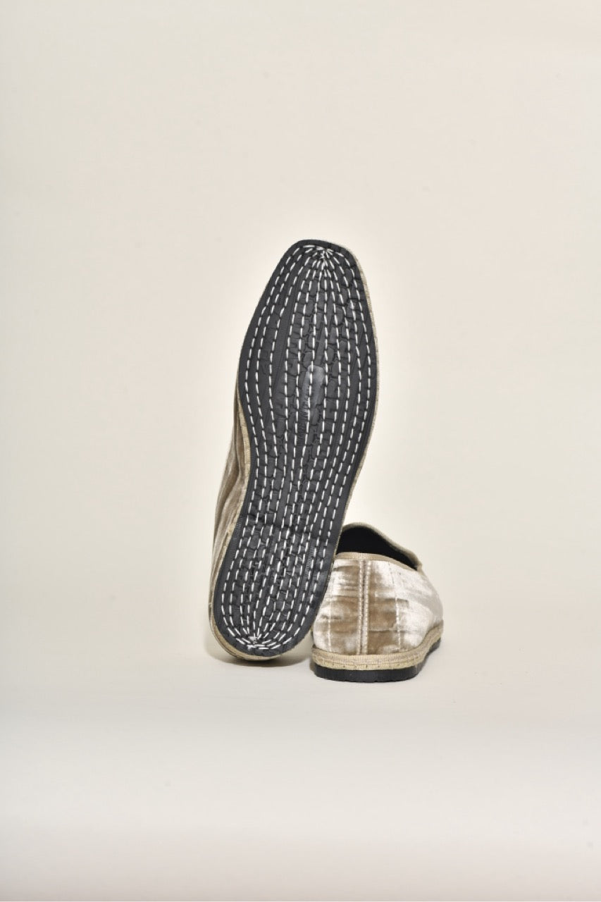 Matières : Velours plissé, doublure velours; semelle en pneu de bicyclette cousue à la main.