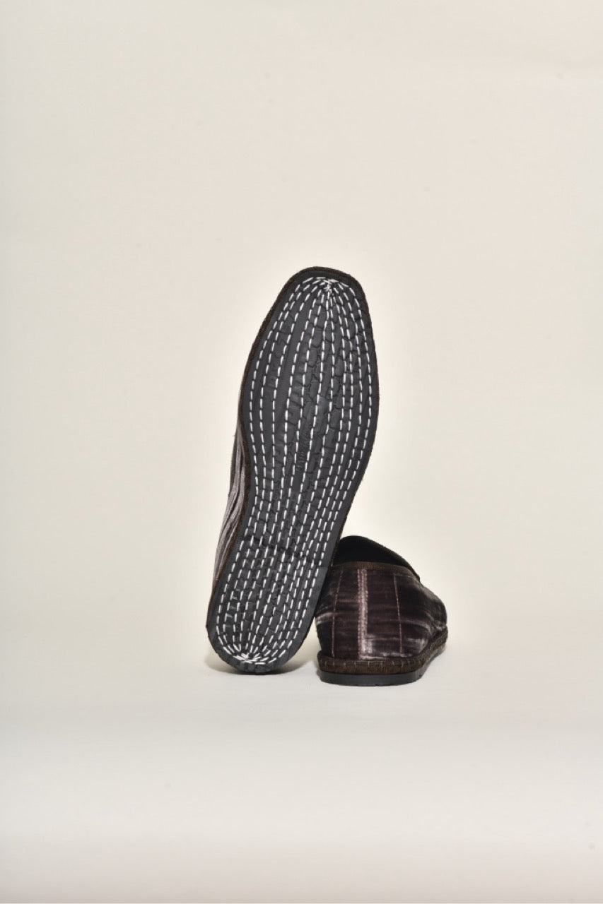 Matières : Velours plissé, doublure velours; semelle en pneu de bicyclette cousue à la main.