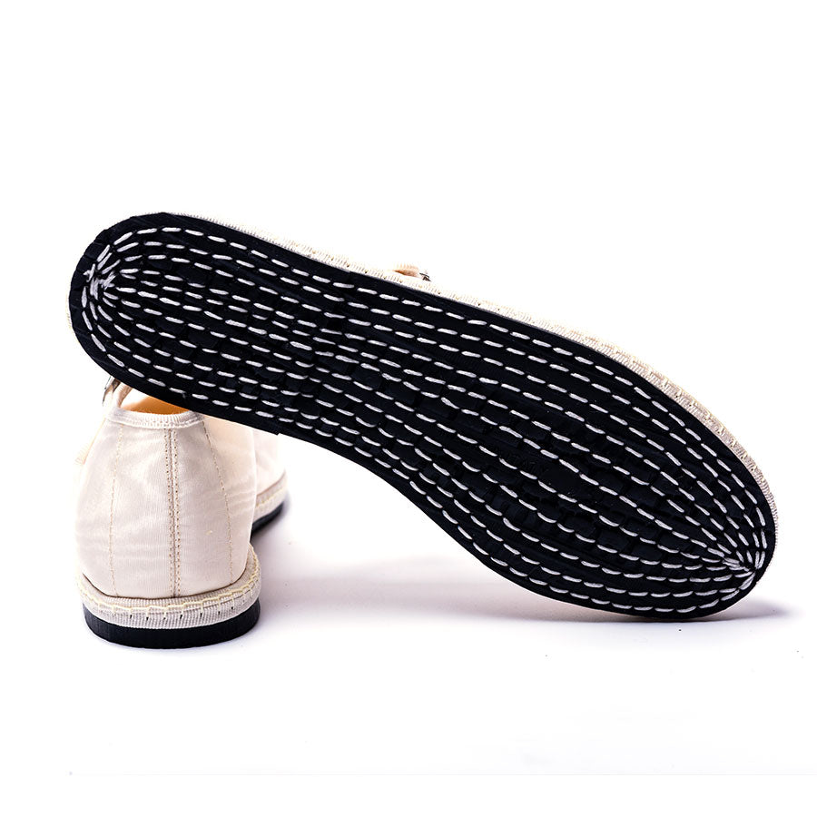 .   Matières :Tissus Moiré blan cassé, doublure identique et semelle en pneu de                        bicyclette cousue à la main.