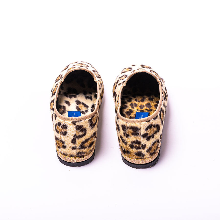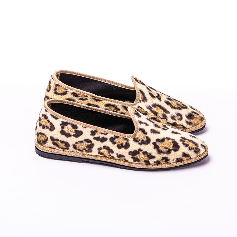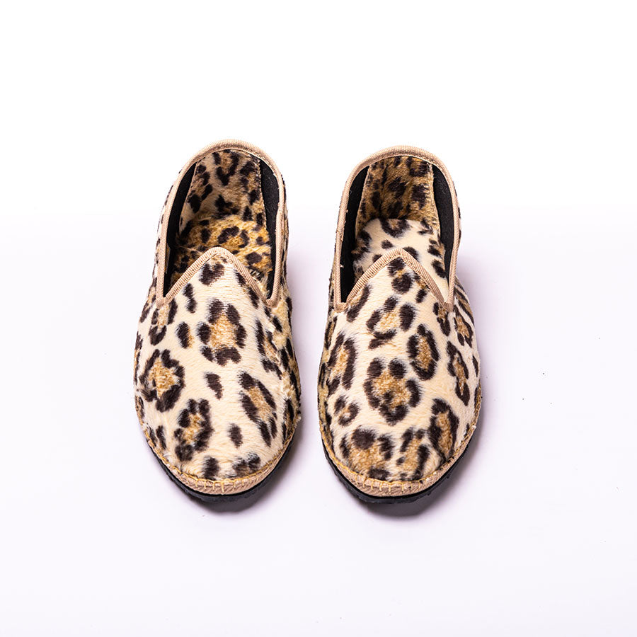 • Matières : Velours de coton impression fauve; doublure velours;  semelle en pneu de bicyclette cousue à la main.