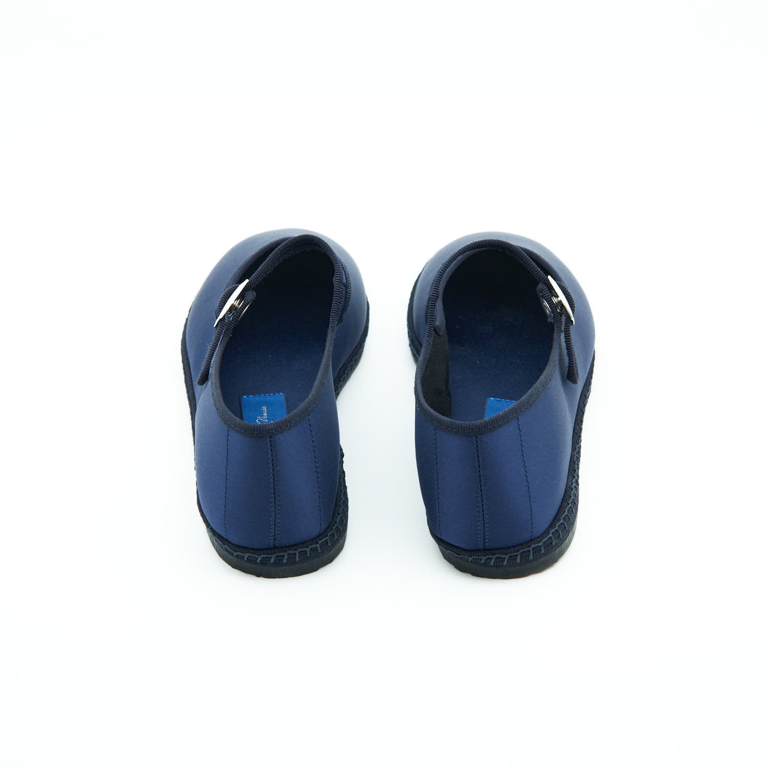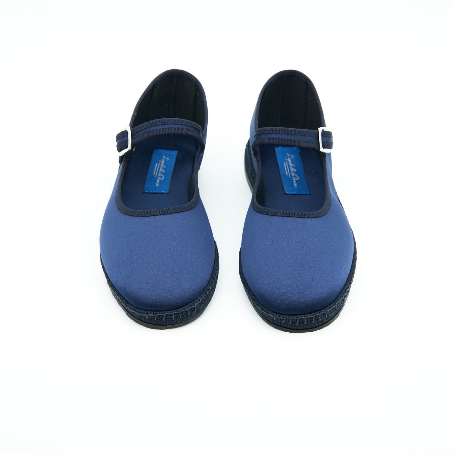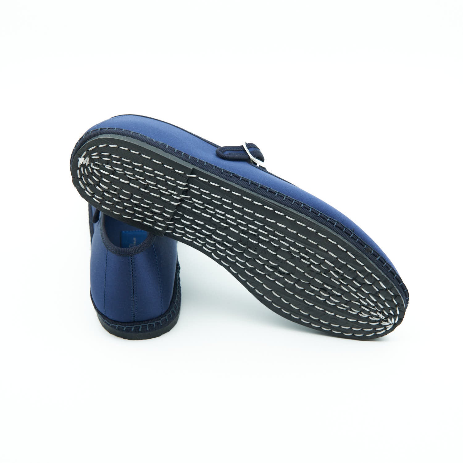 Matières : Satin bleu SMOKING et semelle en pneu de bicyclette cousue à la main.