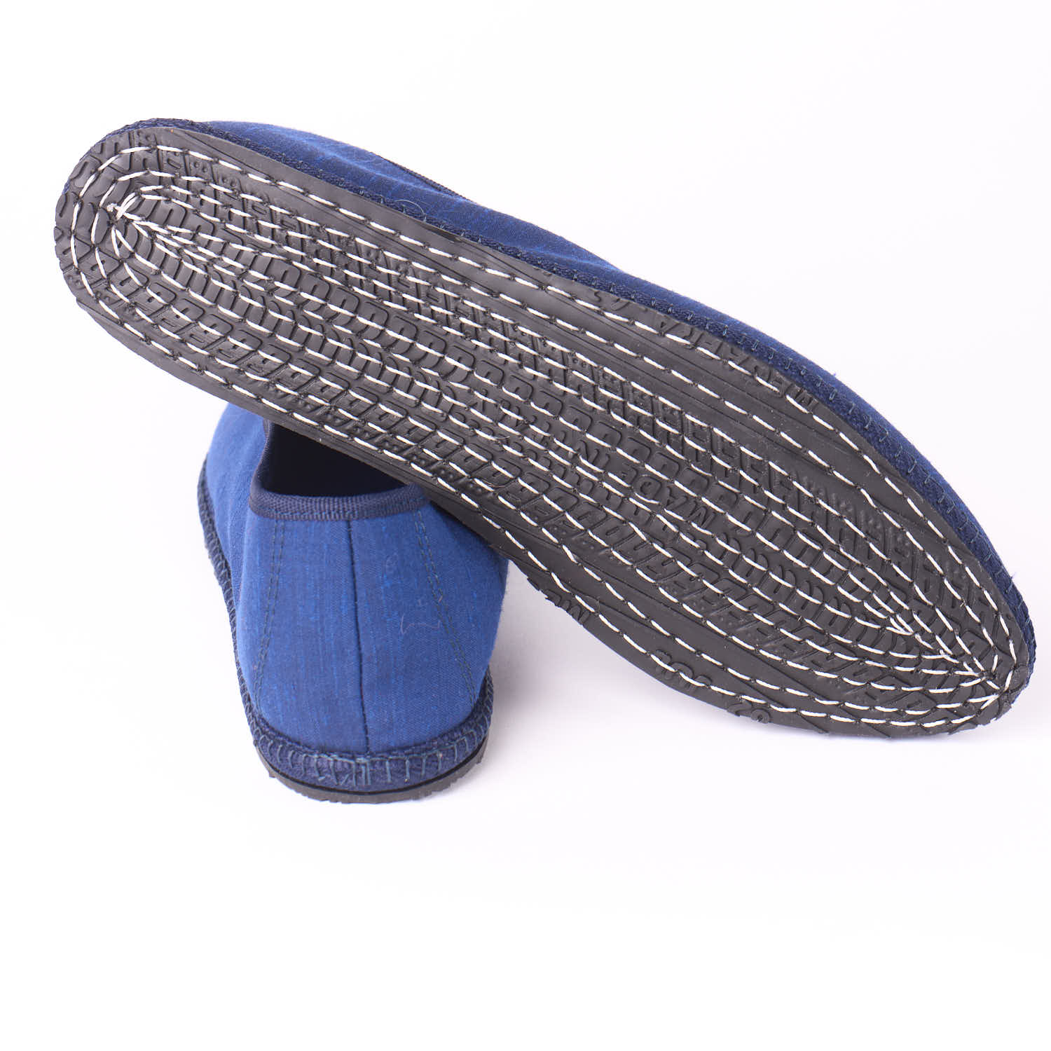 Matières : soie sauvage et semelle en pneu de bicyclette cousue à la main.