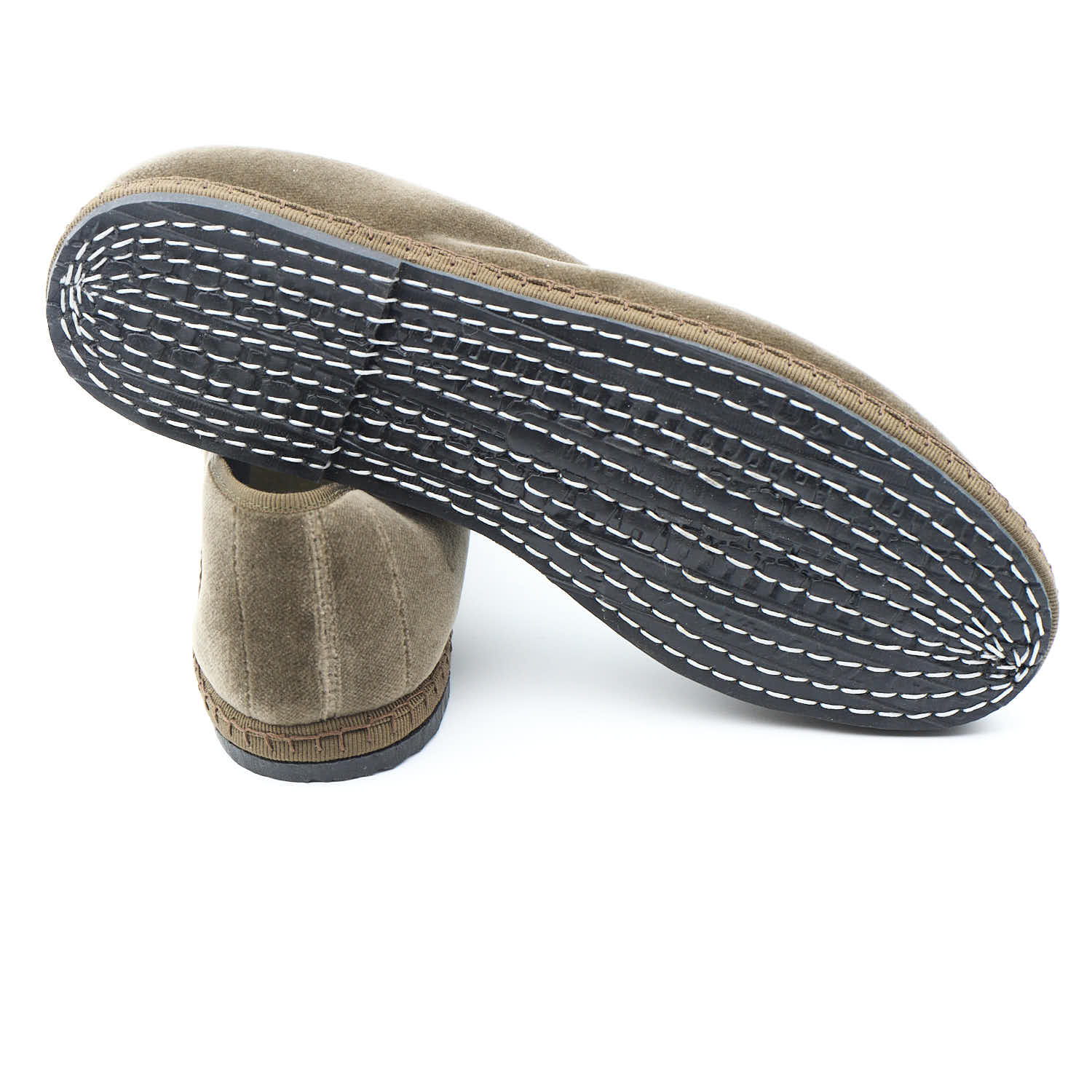 Matières : Velours de coton doublé du même tissu; et semelle en pneu de bicyclette cousue à la main.
