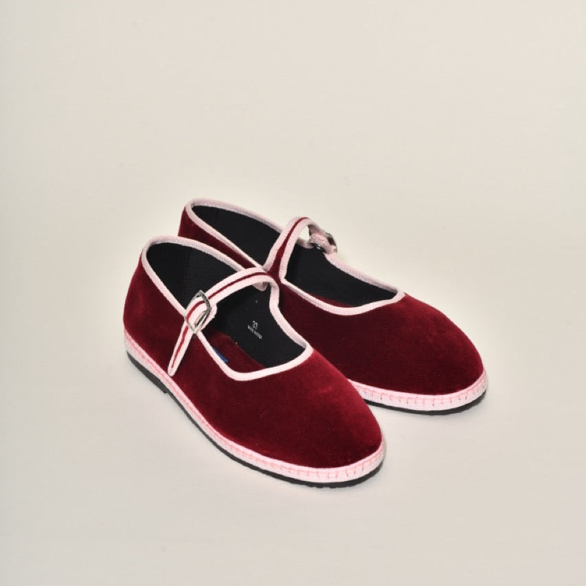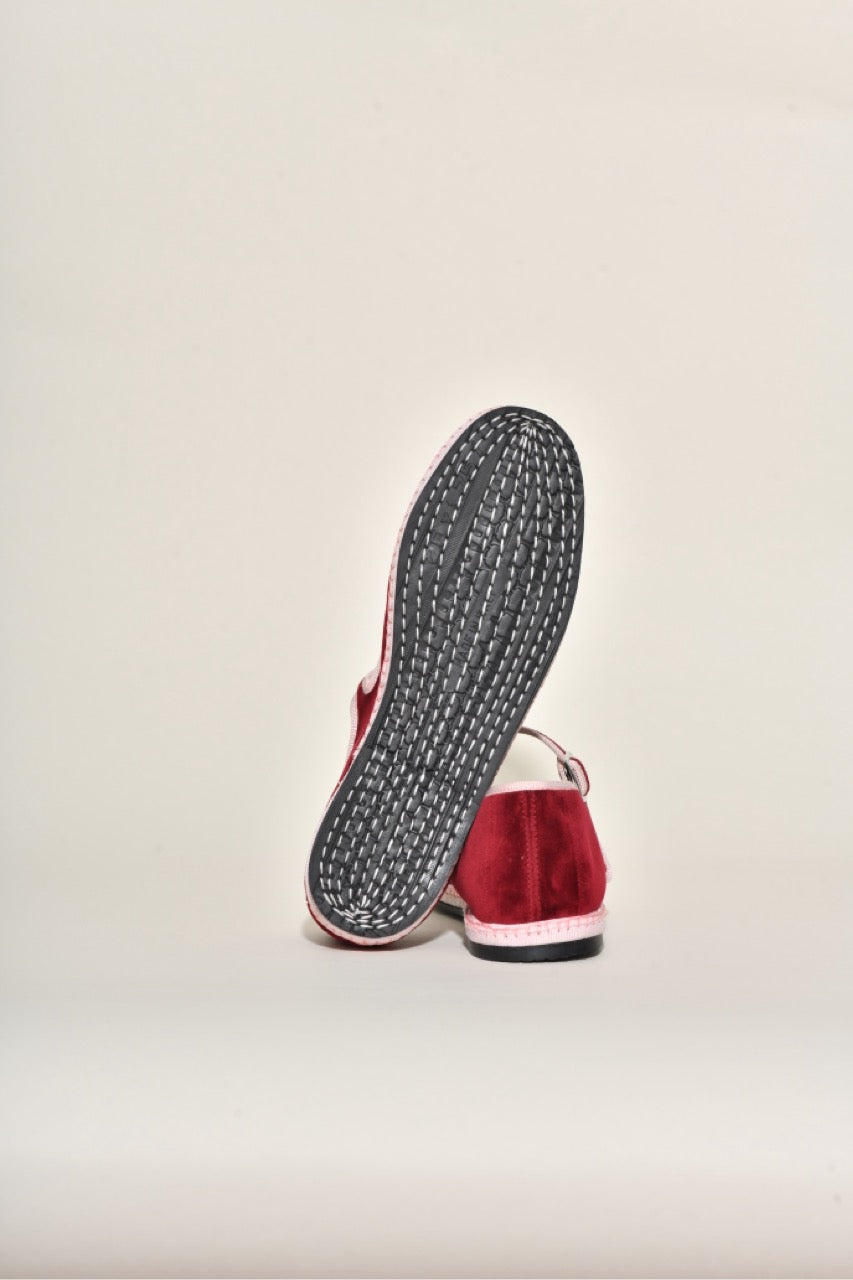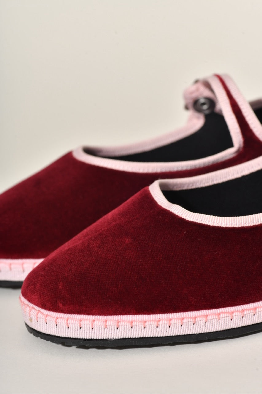 Matières : Velours de coton; doublure coton et semelle en pneu de bicyclette cousue à la main.